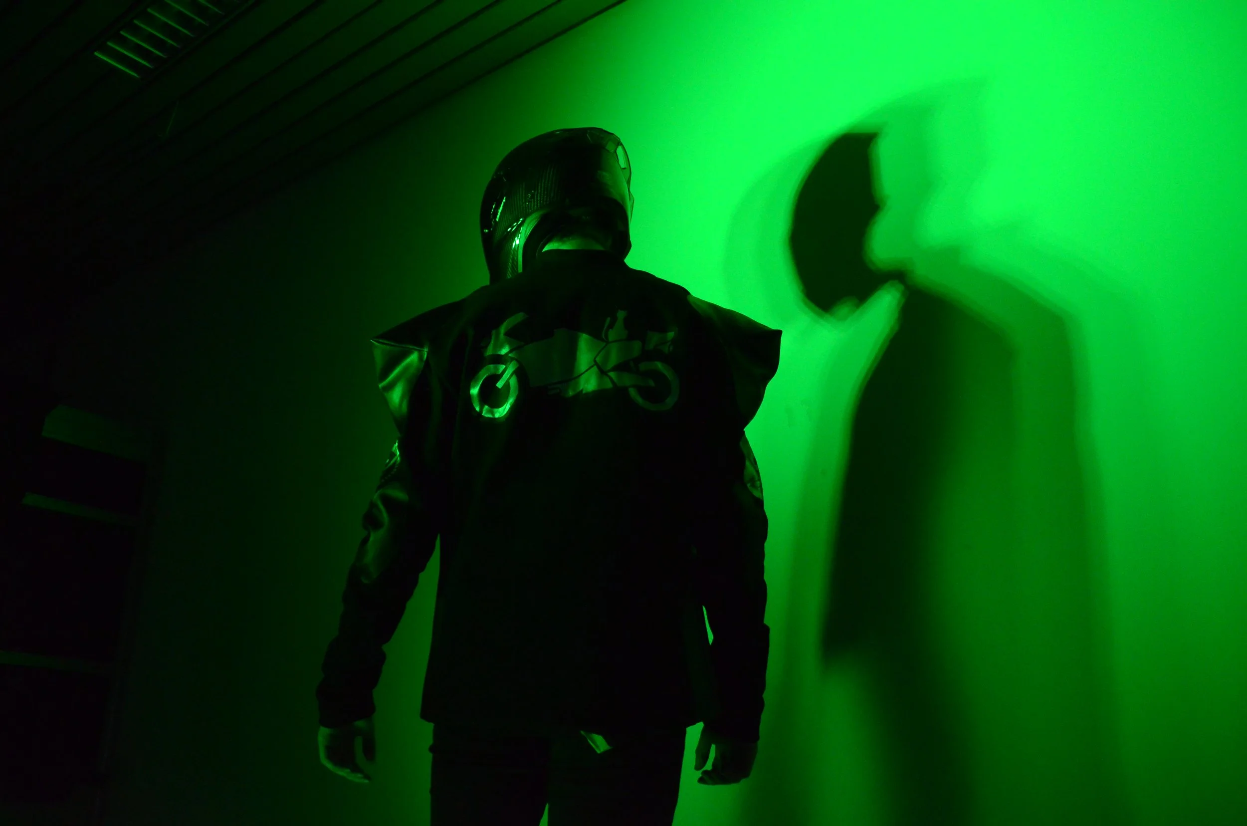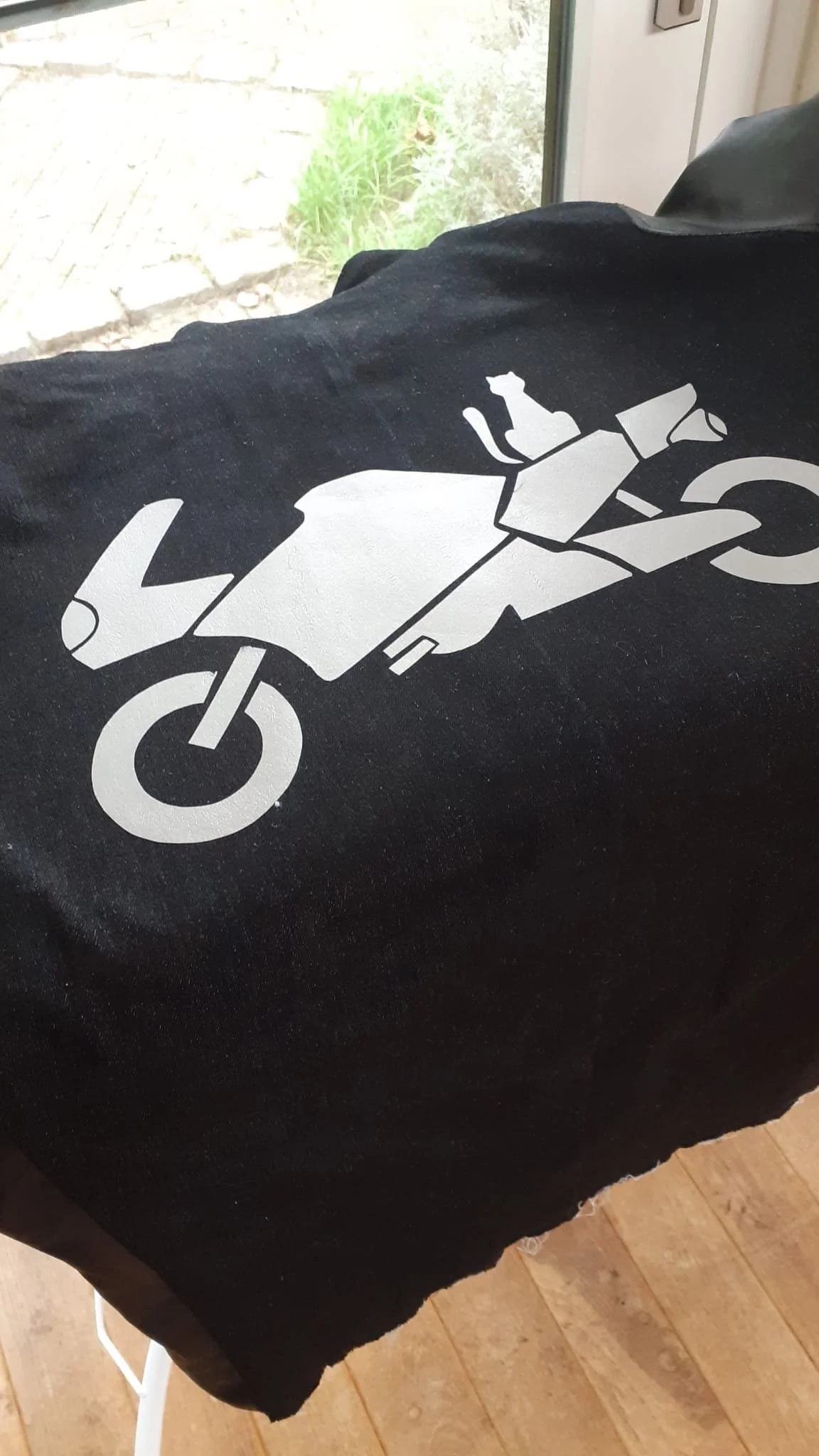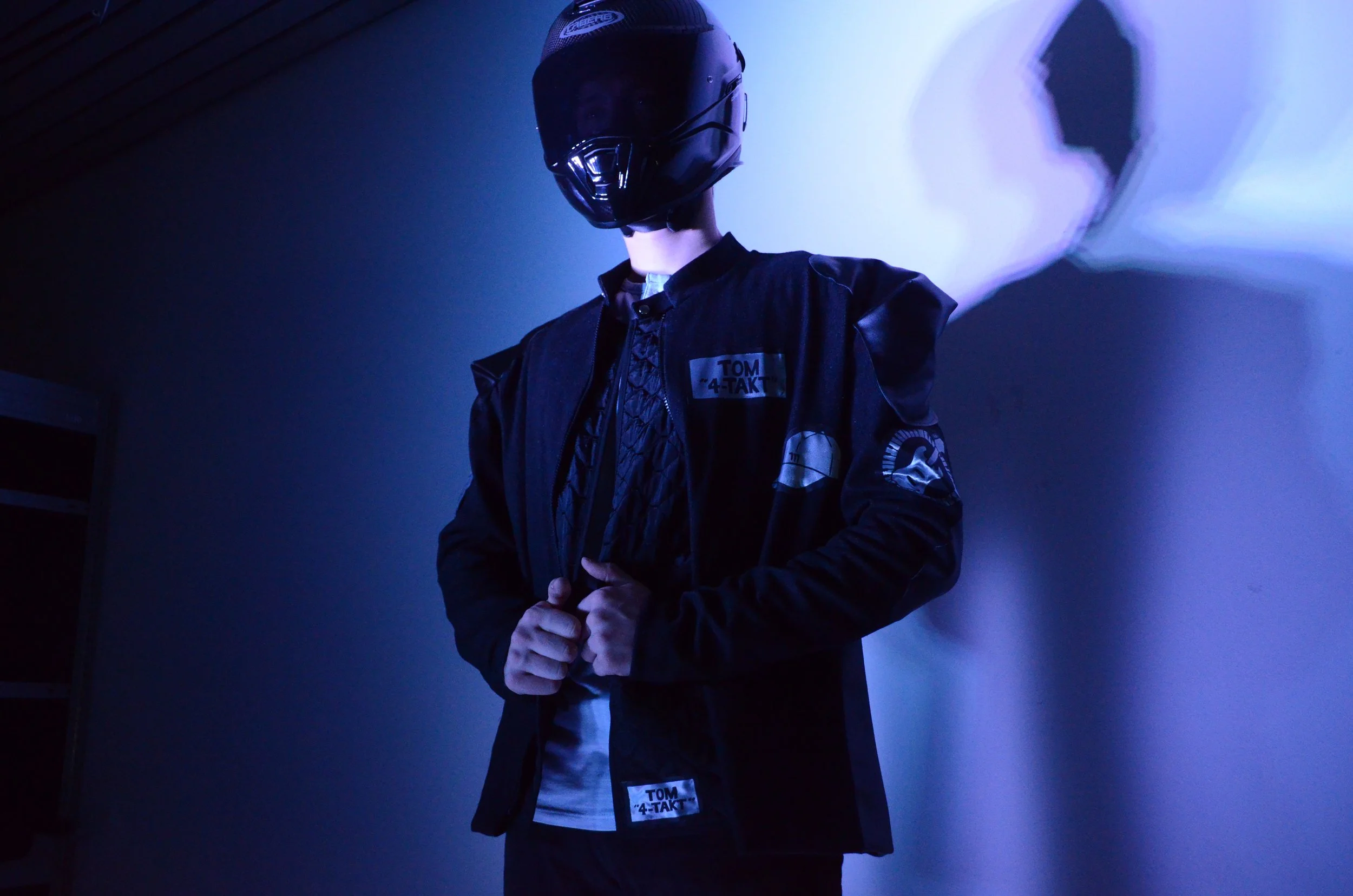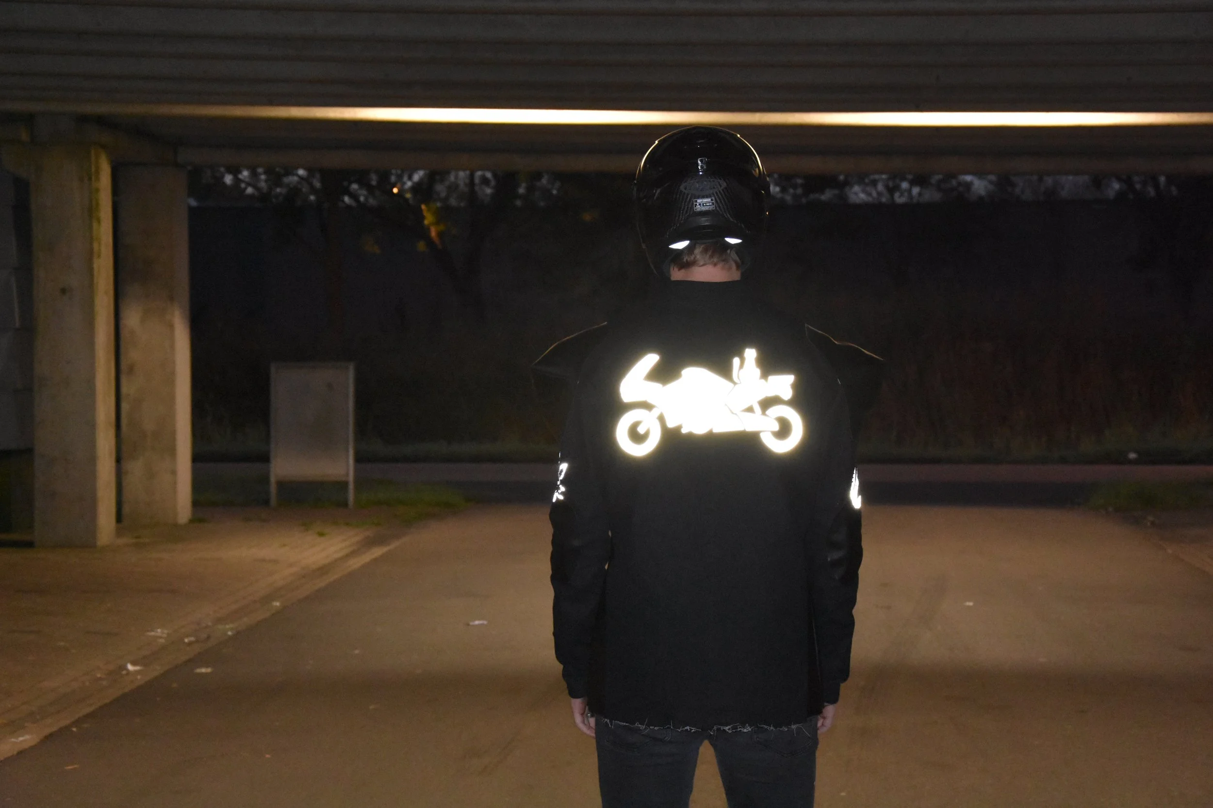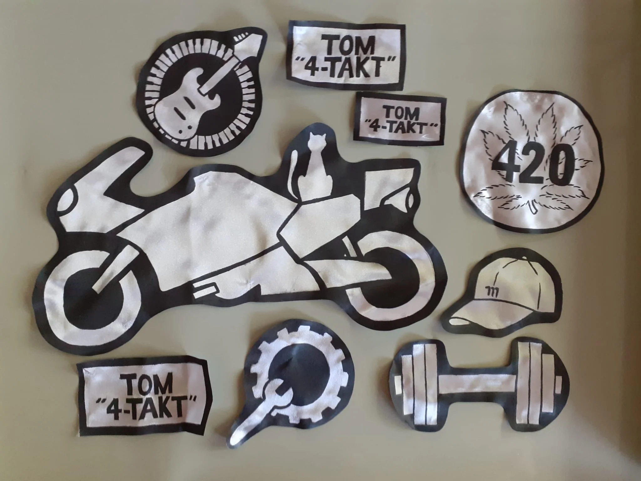 Ik heb samen met de opdrachtgever zijn interesses omgezet in beeldende ontwerpen. Deze emblemen heb ik op alle delen van de jas in reflecterend materiaal aangebracht.